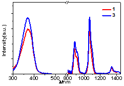 Figure 2. Excitation and near-infrared emission spectra of rare earth complexes 1-4.