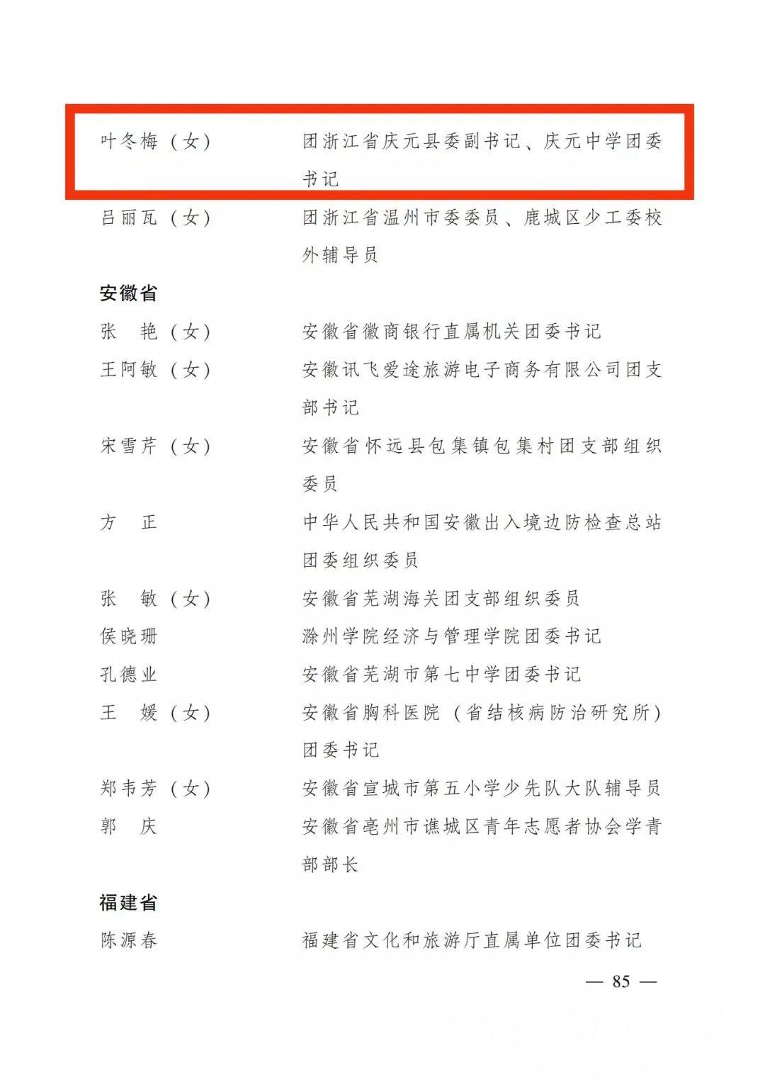 我校10級物理學(師范)專業校友、團慶元縣委掛職副書記、慶元中學團委書記葉冬梅被授予“全國優秀共青團干部”。